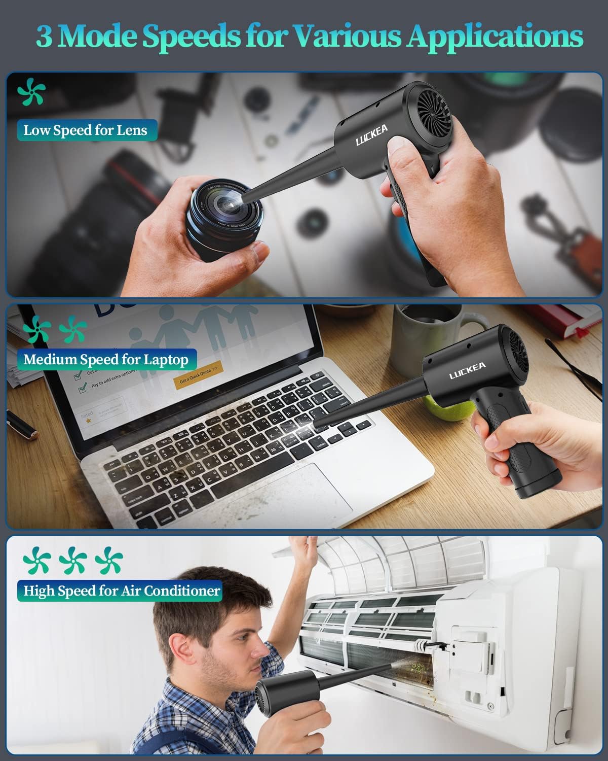 Work Well Than Canned Air - With adjustable 3 gears of airflow design, this mini air duster unleashes a never-ending airflow, it not only can be used for cleaning small objects such as computers, camera lenses, and PS5 but also can be used for cleaning bulky objects such as air conditioners, and sofas, etc.
