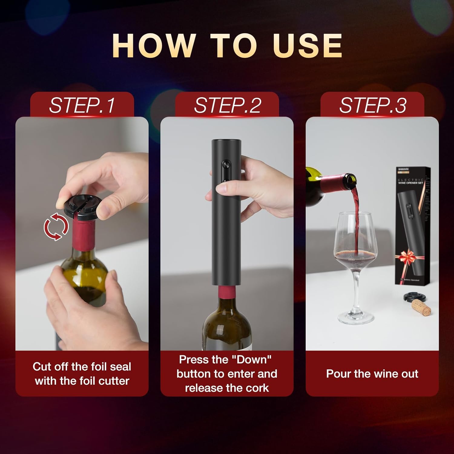 - [User-Friendly] This electric wine opener is designed with a soft-grip body for an easy and comfortable wine-opening process. Just peel, pop, and push, and the cork is out in seconds