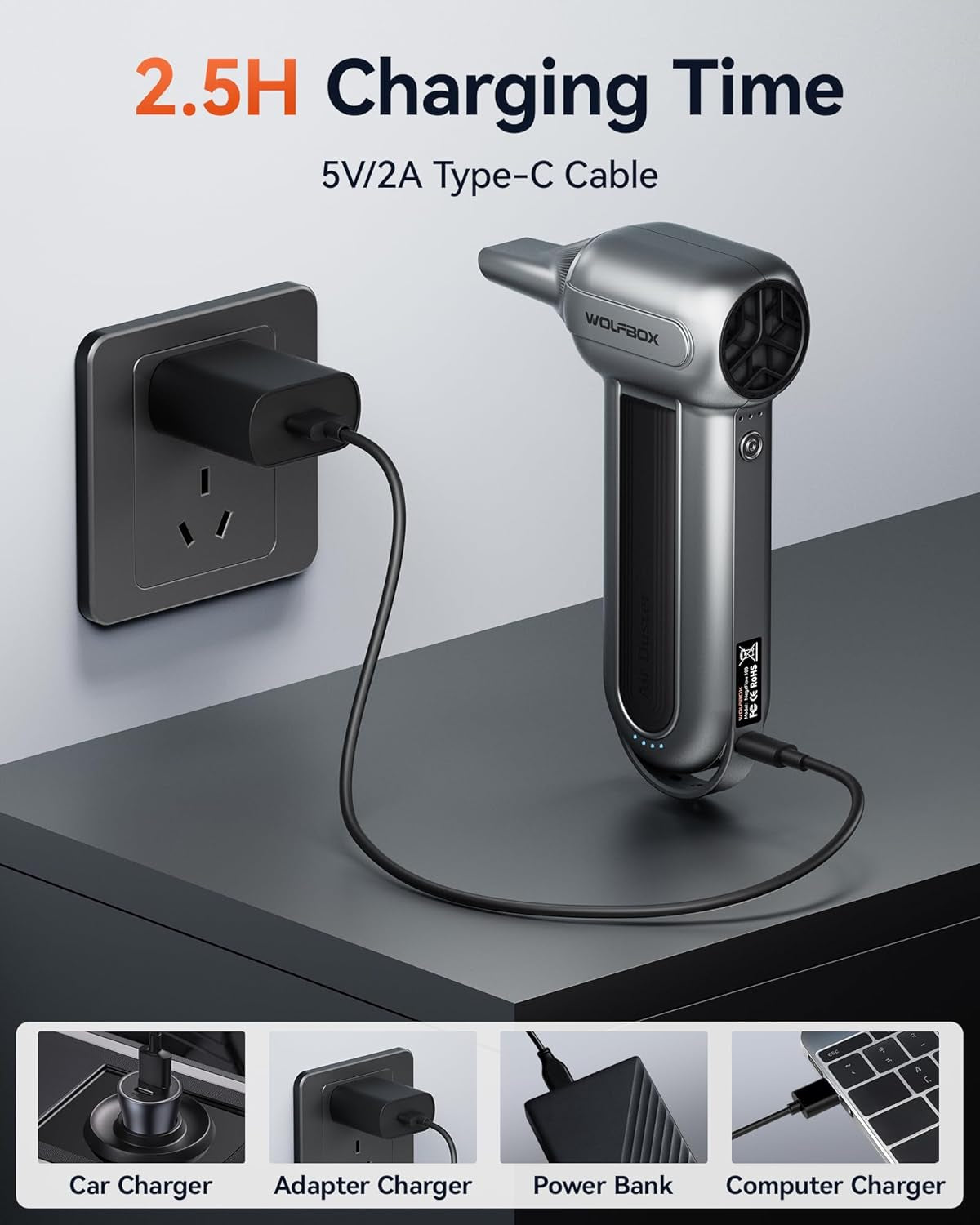 - Compact and Portable Design: Weighing only 0.66lb, the WOLFBOX electric air duster is lightweight and easy to carry. It includes a lanyard for convenient handheld use, making it ideal for indoor cleaning, outdoor adventures, travel, and camping.