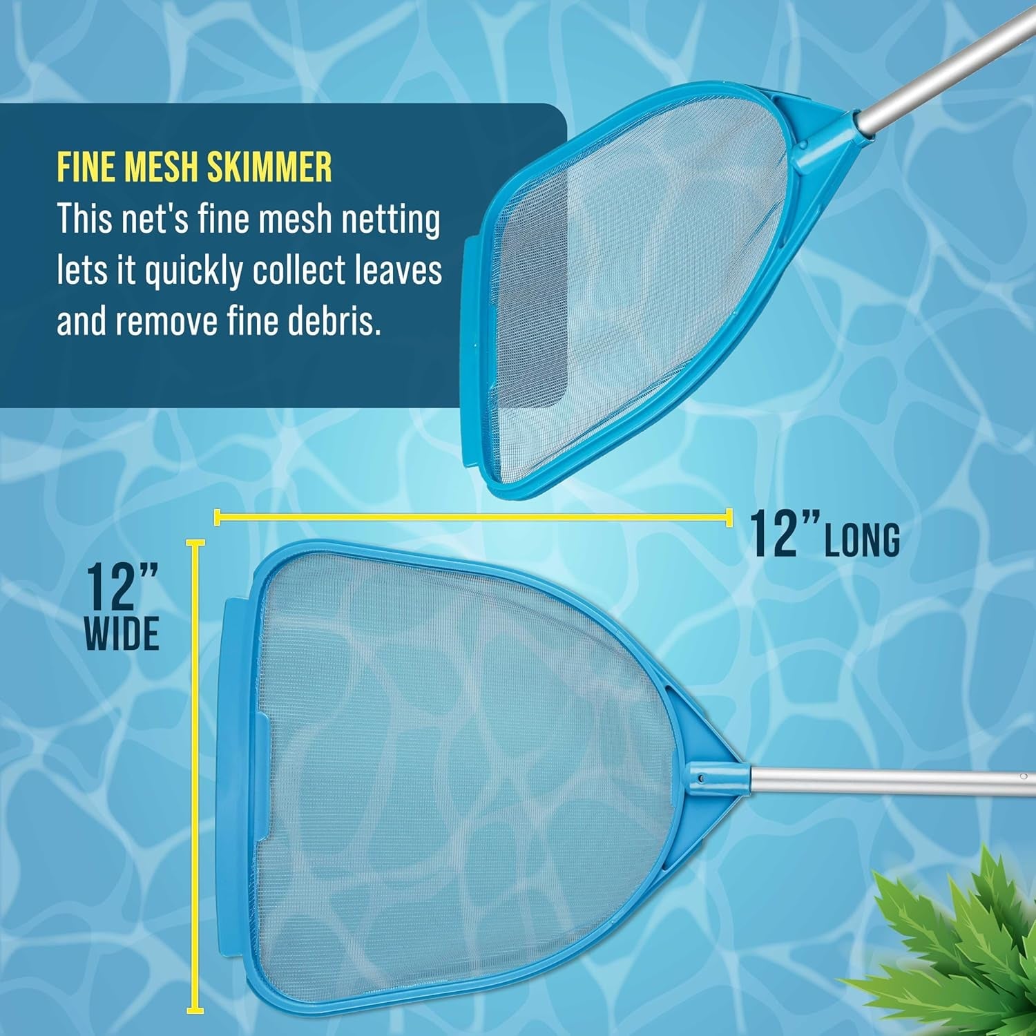 - Sturdy Lightweight Net: The net frame dimensions are 12" wide x 12" long, with fine mesh netting and a 48" long aluminum pole with 5 connecting sections and a plastic handle. The net's durable plastic frame is safe for use in all types of pools, spas, and hot tubs, and it won't mar pool liners.
