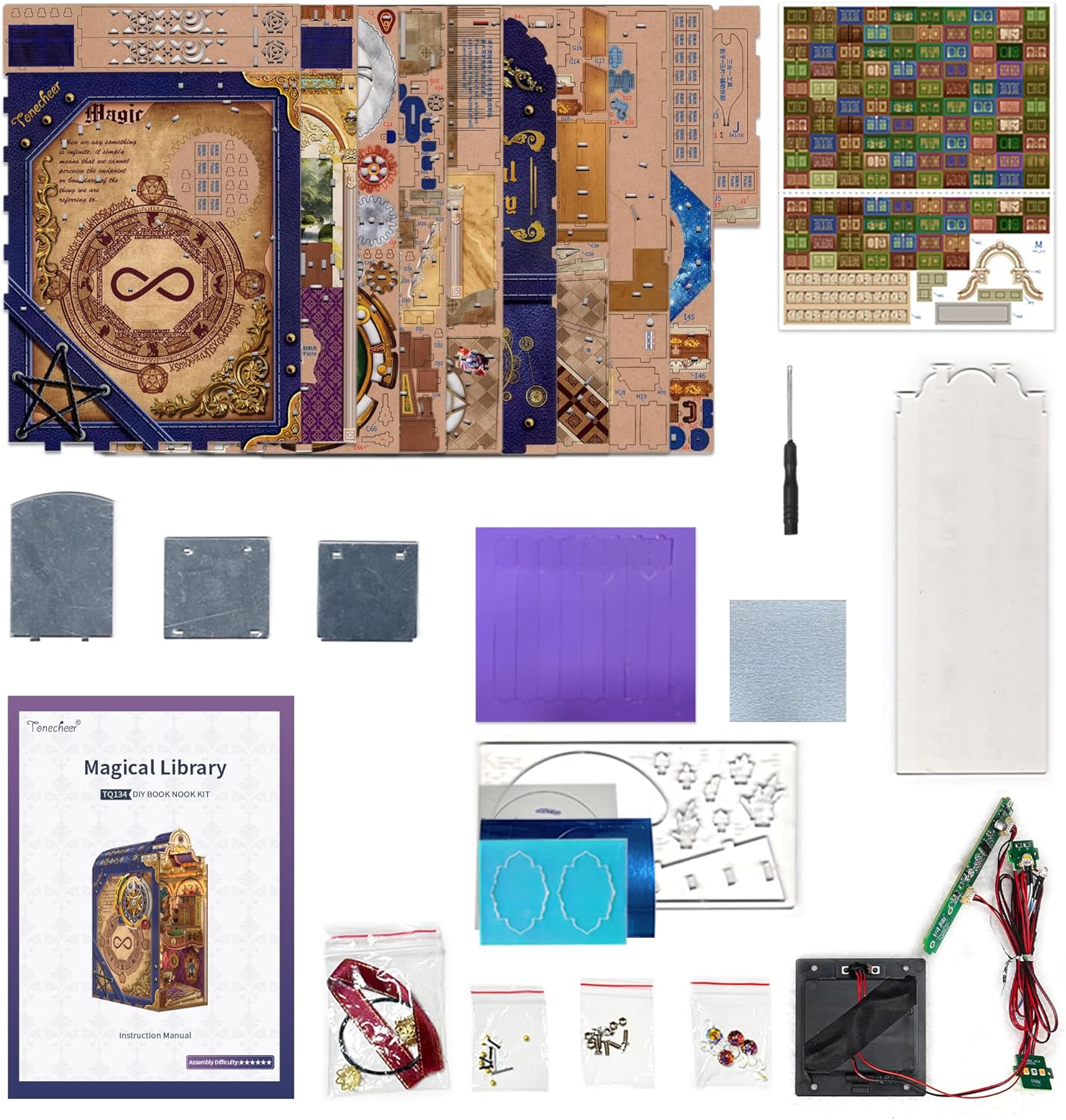 Tonecheer Book Nook Kit with Dust Cover and LED Light, Magical Library Booknook DIY Miniature House 3D Wooden Puzzle, Movable and Rotating Parts, Creative Bookshelf Decor, Unique Gift for Adults